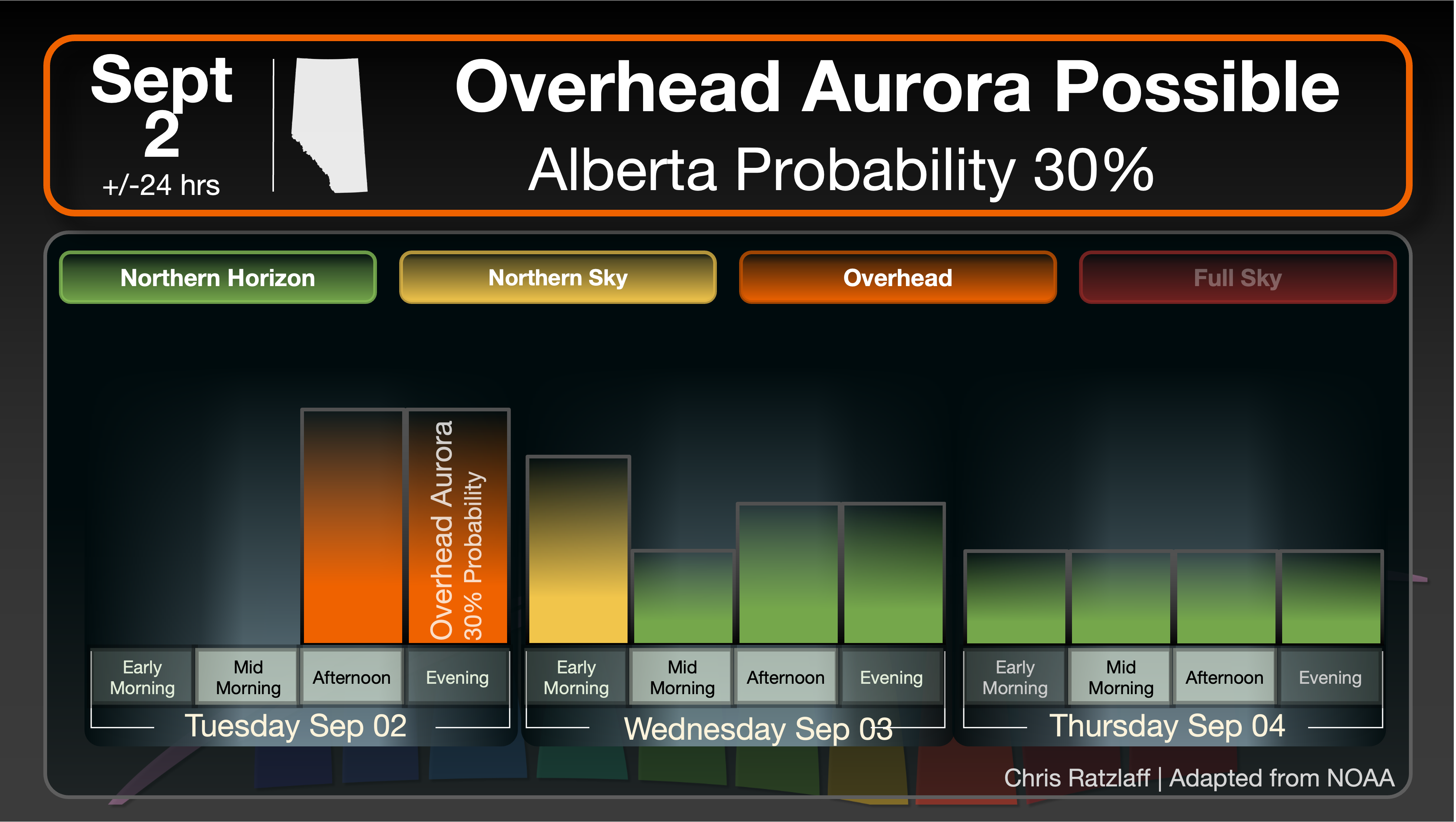 30% probability of Overhead Alberta Aurora tonight, September 2 +/-24hrs